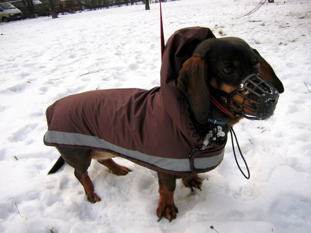 A to są zabiegi Isiowe w celu zdjęcia kagańca Kapturek Isiowy musi być ściągnięty ściągaczami, bo... Kapcio smyczą w kółko jej gasił światło Kilka dni temu wielki dog przebiegał przed Isi nosem, ale w porę Kapcio zgasił jej światło i kobietka nic nie zauważyła A jak biorę ubranko do ręki... To Isia radośnie przybiega, podstawia się, majta ogonem. A kiedy zapniemy już wszystko to kroczy dumnie |